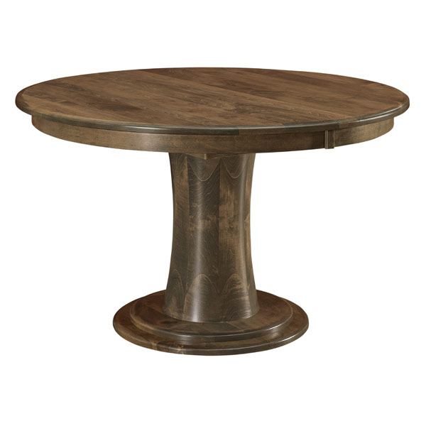 1” round top with waterfall edge is standard. Base standard as shown with levelers.  Available in Oak, Cherry, Quarter Sawn white Oak, Brown Maple, and Rustic Cherry.  Quarter Sawn White Oak tables will have regular White Oak base.  Leaves are 12″ wide.  Floor to the bottom of the skirt 26 1/2″.