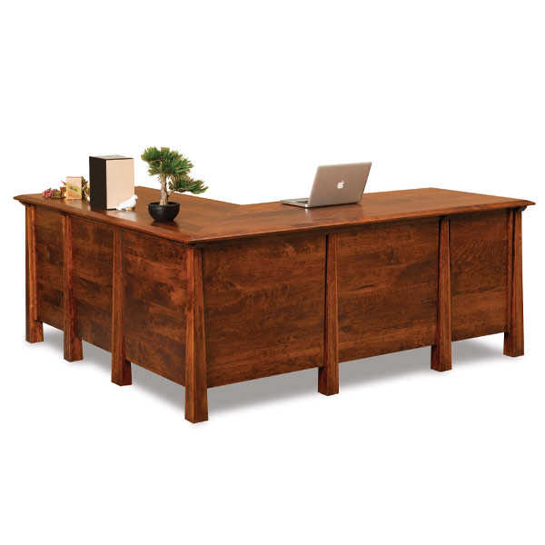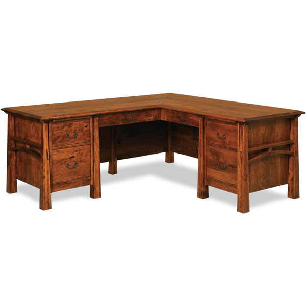 Standard Features: Top has mitered corners, solid, 4 sided tapered legs, keyboard pull-out drawer on left; pencil drawer on right, pullout above drawers, each side, 1 file drawer, each side, finished back, standard hardware.