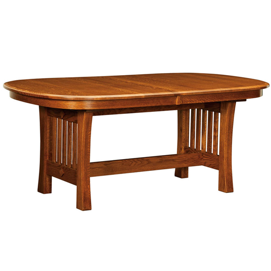 1” top with bevel edge is standard. Banquet style top with bevel edge is standard- also available in rectangle top. Trestle Base 26″ Wide. 60″ Table will take 1 chair on each side. Quarter Sawn White Oak tables will have regular White Oak base. Choose your wood type, stain color, number of leaves, top shape, and table height.