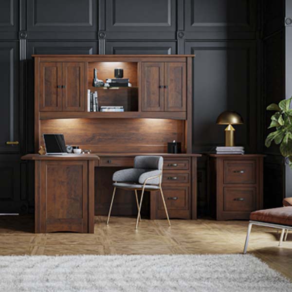 Standard Features: Return on right, keyboard on return, pencil drawer on desk, finished back on desk only, unfinished back on return, 2 file drawers, 4 small drawers, 2 writing pullouts, 6″ overhang on desk side, no cord hole, letter size files. Topper shown in second picture is sold separate.
