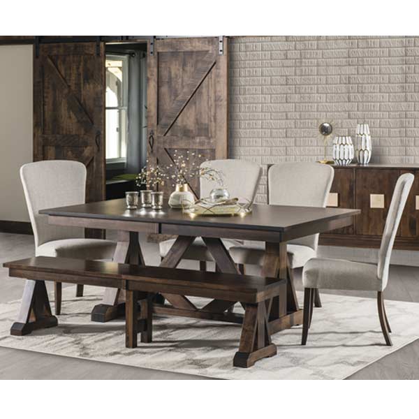 Bailey Trestle Table features 1″ thick rectangle shape top with eased edge. 30″ High. Table has 41″ between trestle ends. Standard wooden equalizer slides. Leaves are 12″ wide and are able to self store inside the table.