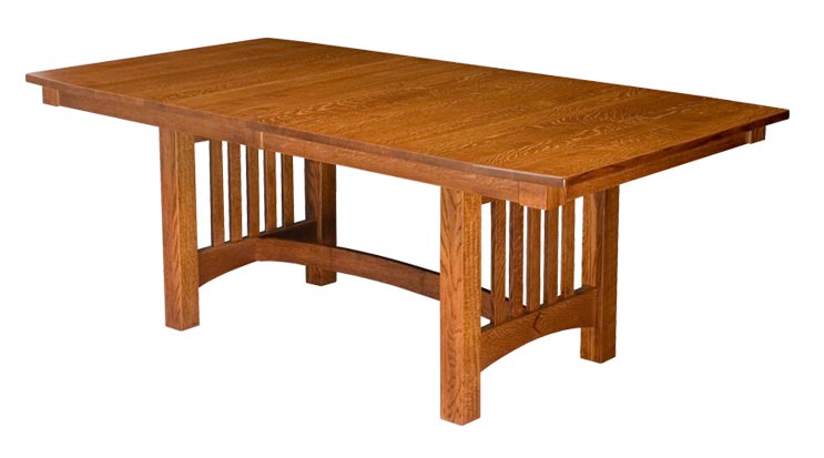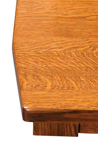 Shown in a 42″ x 72″ Quarter sawn White Oak with standard “winged” corner with a curved trestle base.