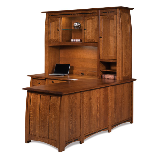 Standard Features: Ebony inlays, curved, reversed panel sides, kneehole 30 1/2 W, each side, keyboard pull-out drawer on left; pencil drawer on right, pull-out drawers each side, 1 file drawer, each side, unfinished back (left side), finished back (right side), grommet in top (hutch side), soft close concealed hinges, dimmable LED touch lighting warm white in work area and open shelf area, 1 adjustable shelf behind small doors, 2 behind large door on right, adjustable glass shelf in center, work area 47 1/4″ W x 13″ D x 22″ H, standard hardware.