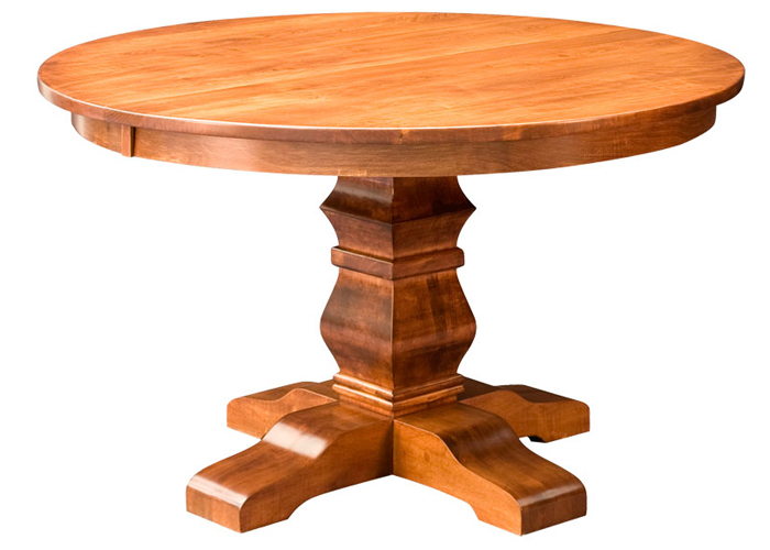 The Bradbury single pedestal table is shown in Brown Maple wood in a 48 inch round size. The pedestal is solid wood with multiple layers of glued up material. The base measures 32″ x 32″ at the bottom. Standard shape his round with a mission edge and 1 inch thick top. This table can have up to three 12″ leaves with skirts which do not self store.