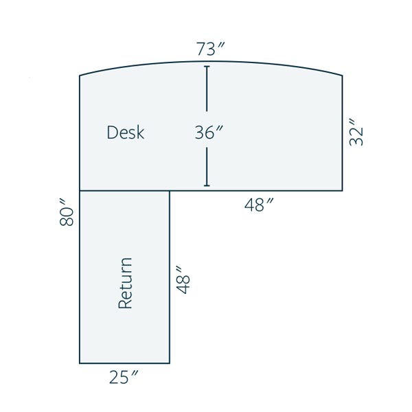 Desk standard Features: Left hand return. Finished back on the desk. Desk has a bow shaped top with 7″ overhang.