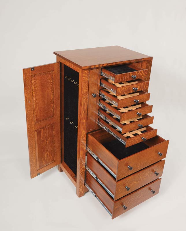 Bungalow Mission Jewelry Armoire is shown in Quartersawn White Oak. Store your jewelry in an organized and elegant fashion. Lots of hooks to hang necklaces, wooden dividers to separate earrings and bracelets, plus a ring bar in the top drawer.