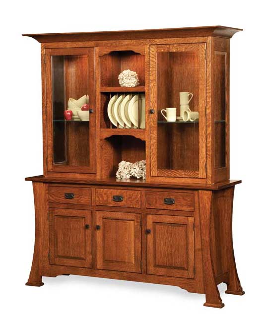Cambridge Hutch features thick curved legs with angles and a plate on the bottom, plate rail, beveled glass, touch lights, light blocking trim in doors, undermount soft close drawer slides, and soft close hinges.