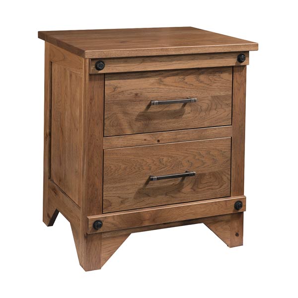 The Cambridge 2 drawer nightstand features decorative black metal bolts that give this collection an industrial look.