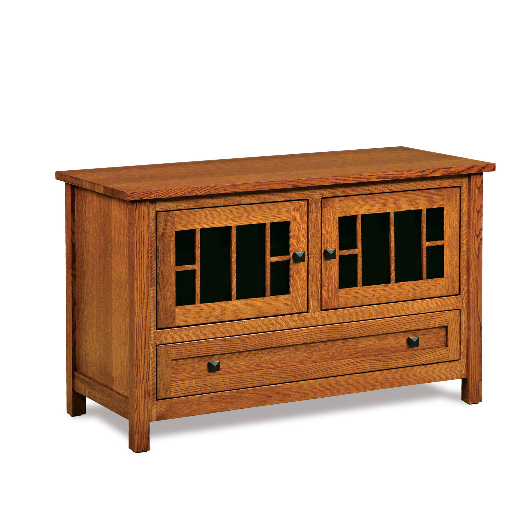 Centennial TV Stand is shown in Quartersawn White Oak with Michael’s Cherry.