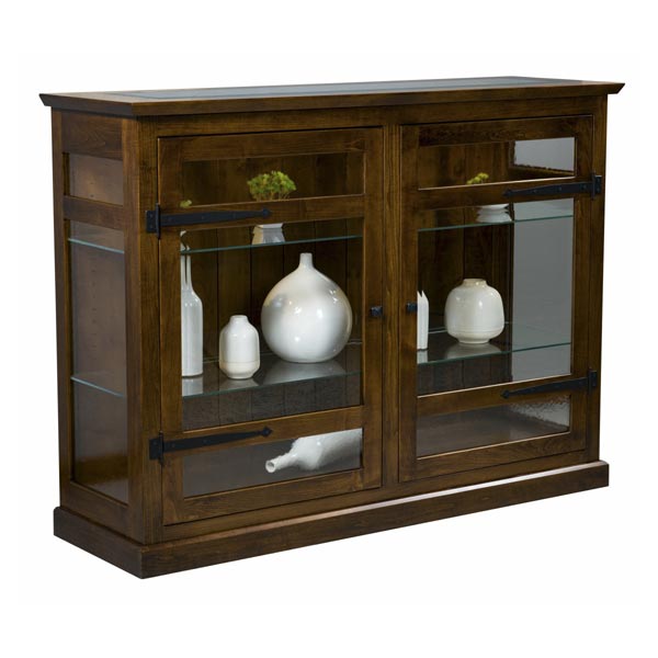 Standard Features: Soft close doors, beveled and antique glass, beveled glass top, 2 adjustable shelves, shiplap back, and LED touch lights.