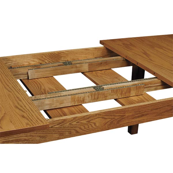 The Christy is a leg table that functions more like a trestle table. The legs on this table remain stationary when adding leaves. It has standard gear slides and is able to self store up to 4 leaves in all sizes. Shown in Oak with New Carrington stain.