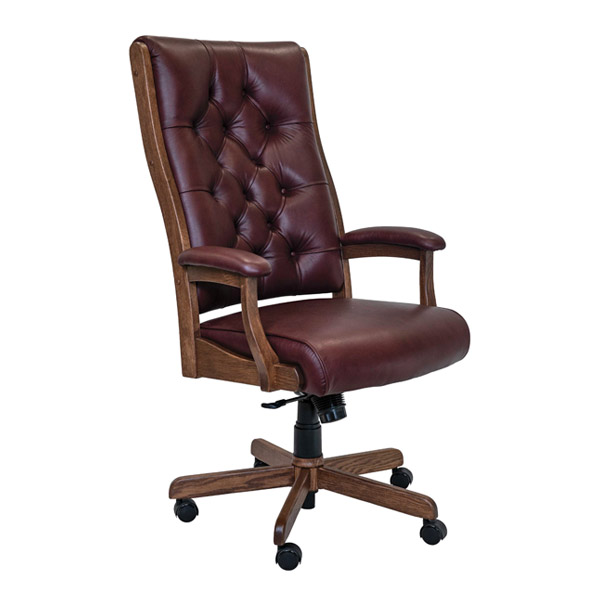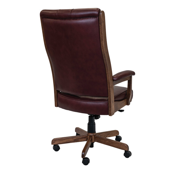This chair comes in all the listed wood types and stain options. It is available in leather or fabric seat and is very high quality! The gas lift system allows up-down or lock the back in position. It has a tension setting for how much “rock” you want in the chair. Chair will spin 360. Shown with leather seat.