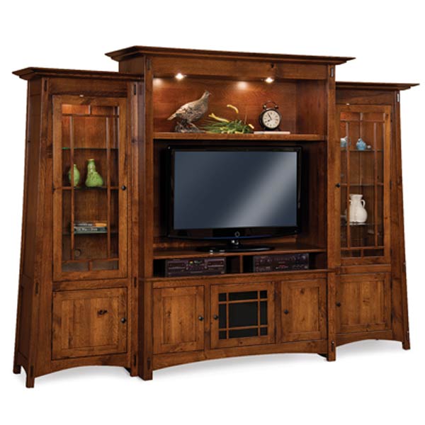 Standard Features: smoked glass in center piece door, soft close concealed hinge doors, leg levelers, adjustable shelf with touch lighting above tv area, 1 adjustable shelf behind each wood door, two-piece center unit, LED touch lighting with 6 adjustable glass shelves, and standard hardware.