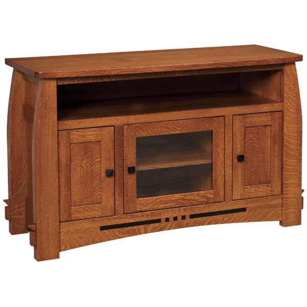 TV Console features 3 soft close doors with one adjustable shelf behind each door and an open compartment. Shown in Quarter Sawn White Oak with standard hardware and standard ebony inlays. Handcrafted to heirloom quality, please allow up to 12 weeks for delivery. Priced in Oak.