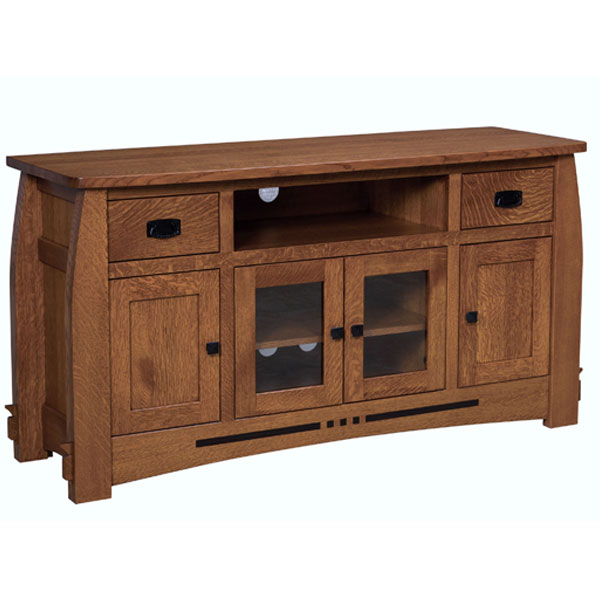 TV Console features 4 soft close doors and 2 full extension drawers. 1″ solid tops and an adjustable wood shelf behind each door. Has curved sides giving it a rounded look and has a bowed top. Ebony inlays are standard but can be removed at request. Excellent addition to any living room or entertainment space.