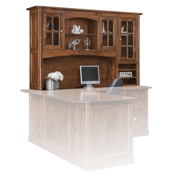 Standard Features: Will fit CCD 32RD corner desk, mullion doors, clear glass, glass shelves in upper doors, unfinished back, 5 puck lights with dimmer.