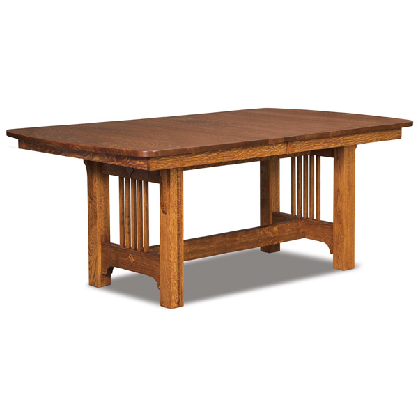 Craftsman Mission Trestle Dining Table is shown in Quartersawn White Oak with Michael’s Cherry stain.