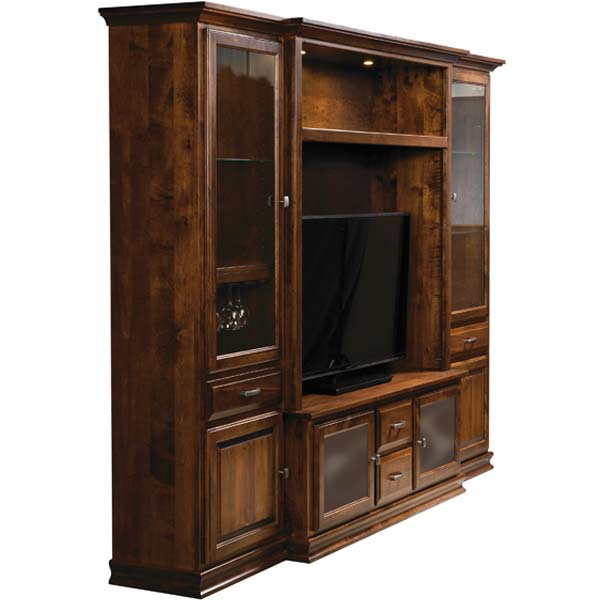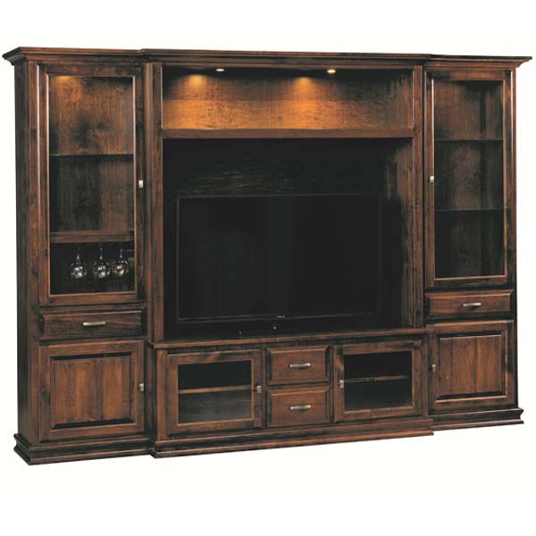 Standard Features: Back panel behind TV is 3/4″ thick and slides forward so TV can be mounted to it. 1 adjustable glass shelf in left side, 2 adjustable glass shelves in right side, and 2 adjustable wood shelves in console. Wine pull out with stemware holder, soft close doors, full extension drawer slides, and LED lights.