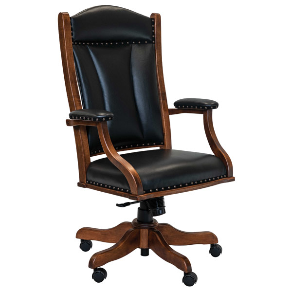 This chair comes in all the listed wood types and stain options. It is available in leather or fabric seat and is very high quality! The gas lift system allows up-down or lock the back in position. It has a tension setting for how much “rock” you want in the chair. Chair will spin 360. Shown with black leather seat.