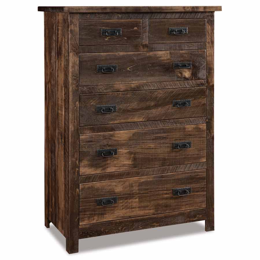 The Dumont 6 Drawer Chest is shown in Rustic Rough Sawn Brown Maple with Almond stain. Rustic styled collection works well in several homes. Built to heirloom quality. These pieces are made to be passed down for generations. The Rough Sawn adds texture and character to each piece of furniture.
