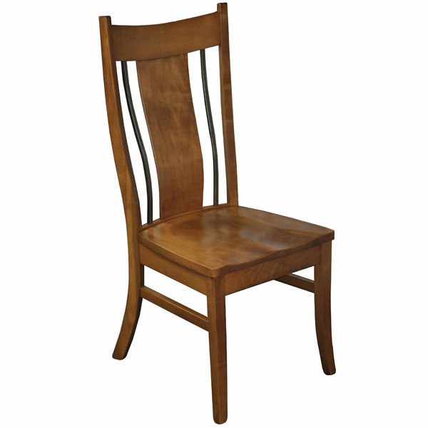 Eagle Side Chair with wrought iron is shown in Brown Maple. Black Metal detail fits with industrial design styles. Select your wood type and stain color. Choose to add a fabric or leather seat. You can also add arms.