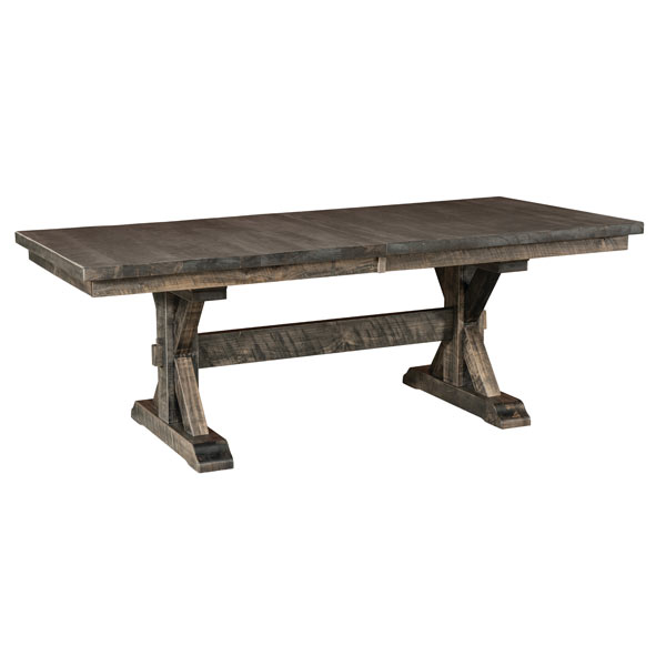 Elkhorn Trestle Table has a 1 3/4″ rough sawn top with distressed edge.  Leaves are 12″ wide standard.  Has geared equalizer slides.  Available in Rustic Rough Sawn Brown Maple only.  Features square top with distressed edge. This dining table is 30″ high, call for pub height.