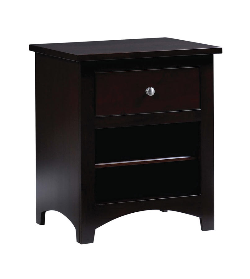 The Ellington 1 Drawer Nightstand is shown in Brown Maple and Rich Tobacco stain. It features classic clean lines that make this set timeless.