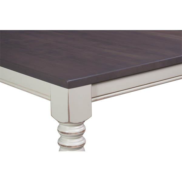 The Farmington leg table is shown in 42″ x 72″ Brown Maple with painted legs and skirts.