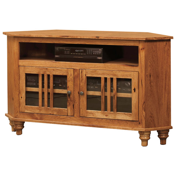 Corner Unit TV Stand Shown with standard hardware. Select your wood type and stain color. Features 1 fixed shelf and soft close doors.