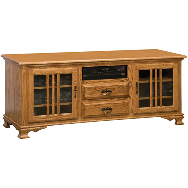 Plasma stand features 2 soft close doors with 2 adjustable shelves behind each door. 2 full extension drawers. Shown in Oak with standard hardware. Handcrafted to heirloom quality.