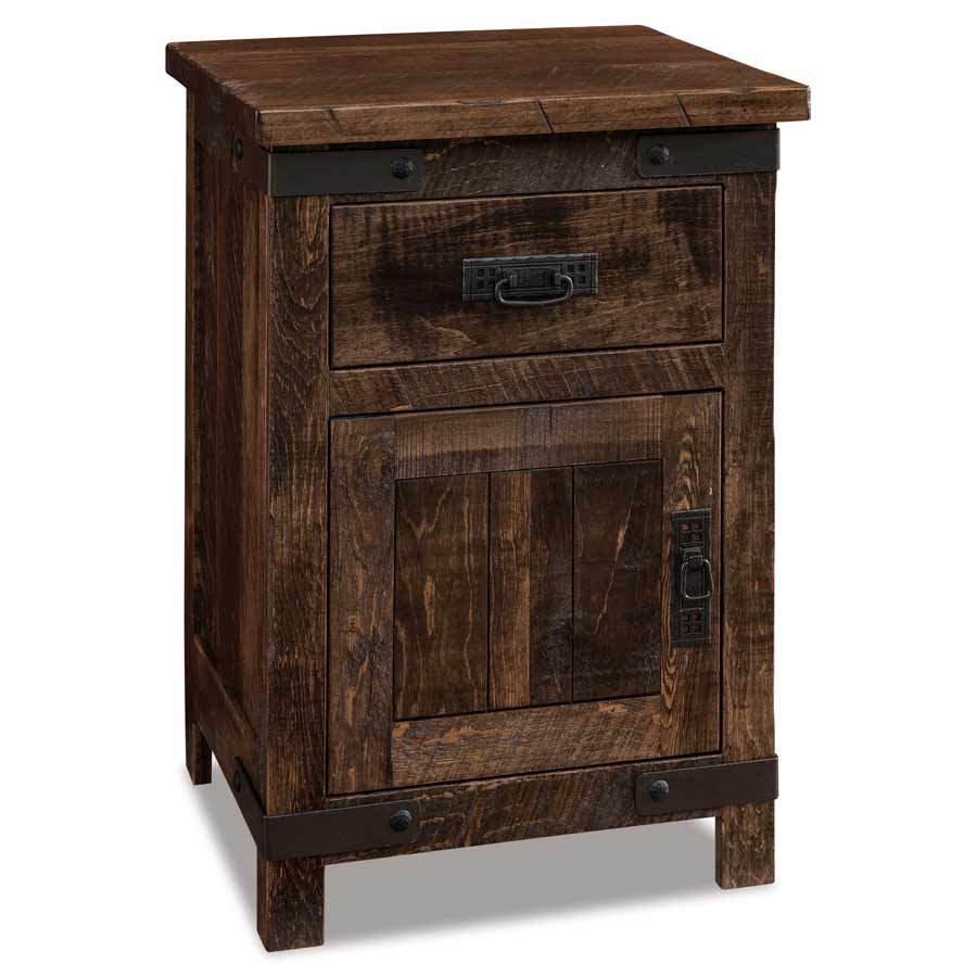 This nightstand features 1 door, and 1 drawer that can be upgraded to soft close under-mount slide. The Ironwood Collection is only available in Rustic Rough Sawn Brown Maple. Features 1.25” solid wood inset end panels. All doors and drawers are flush with this collection. The most unique part of this set is the metal detailing that is thoughtfully crafted into each piece of the collection. Industrial style works well in several homes.
