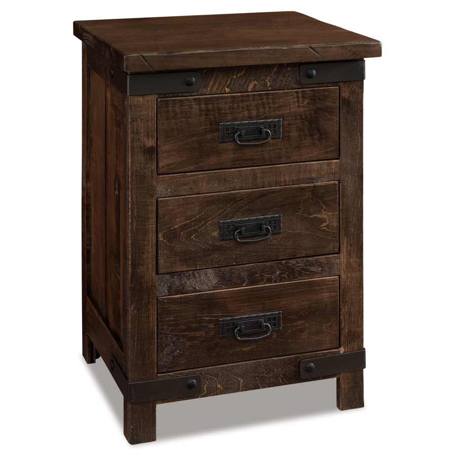 Ironwood Nightstand features three drawers perfect for a little extra storage in your bedroom. Get 2! One for each side of the bed. The Ironwood Collection is only available in Rustic Rough Sawn Brown Maple. Features 1.25” solid wood inset end panels. All doors and drawers are flush with this collection. The most unique part of this set is the metal detailing that is thoughtfully crafted into each piece of the collection. Industrial style works well in several homes.