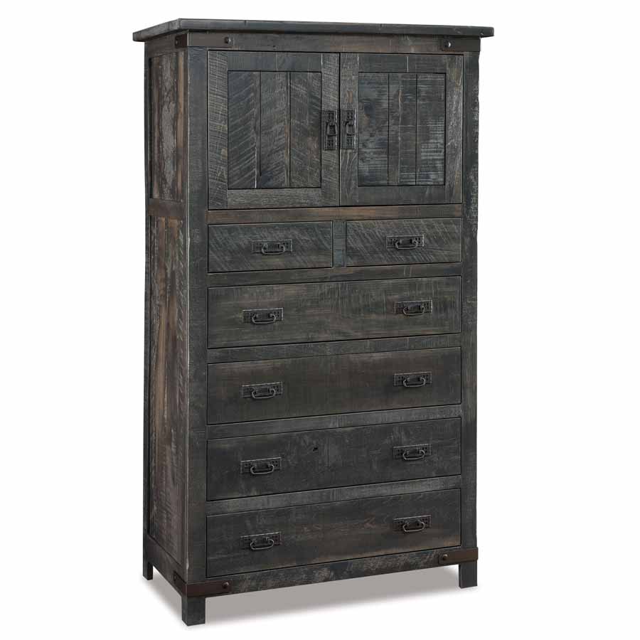 Chest Armoire features 6 drawers, 2 doors, and 1 adjustable shelf. Drawers can be upgraded to have soft close drawer slides. The Ironwood Collection is only available in Rustic Rough Sawn Brown Maple. Features 1.25” solid wood inset end panels. All doors and drawers are flush with this collection. The most unique part of this set is the metal detailing that is thoughtfully crafted into each piece of the collection. Industrial style works well in several homes.