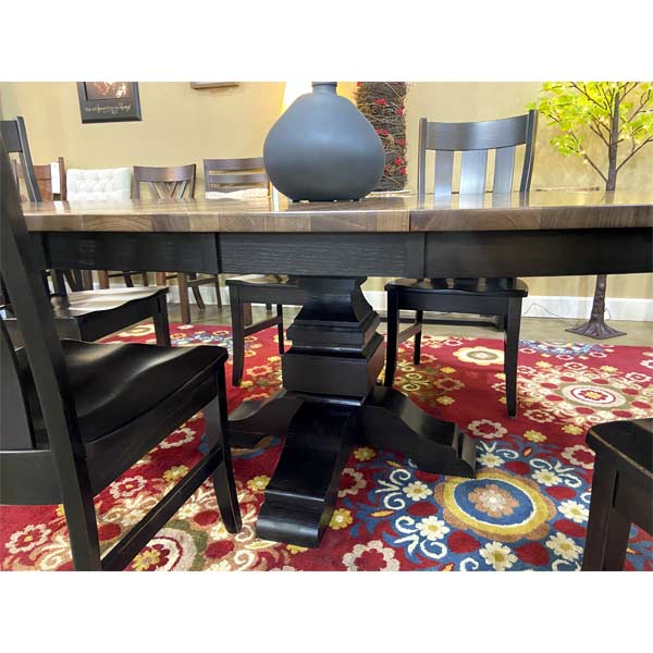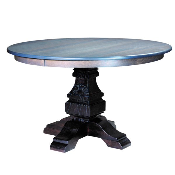 Kendrick Pedestal Table features a 1″ thick round top with mission edge, leg levelers, and can add up to 2 leaves.