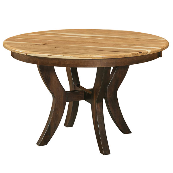 The Kirksville Pedestal Table features a 1″ thick round top with waterfall edge, leg levelers, and can have up to 3 leaves.