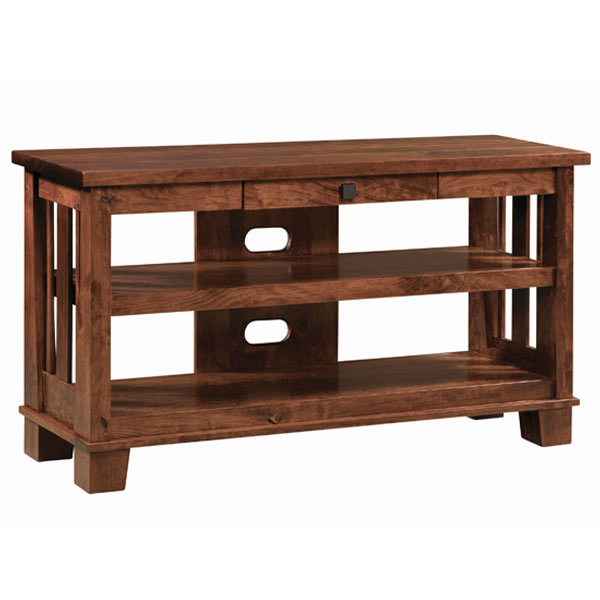Open TV stand features full extension drawer with standard hardware, and an open design perfect for display your favorite home decor. Top has plank look that gives it an rustic feel.
