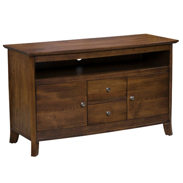 TV Console features flush doors and drawers with a 1″ thick bow top. Each door is soft close and has an adjustable shelf behind it. Shown in Brown Maple with standard hardware.