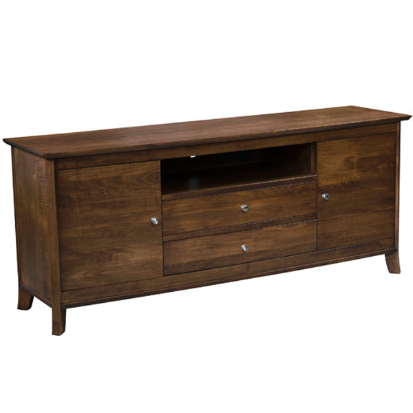 TV Console features flush doors and drawers with standard hardware. Shown in Brown Maple. Has 1″ thick bowed tops and sleek design. There is 1 adjustable shelf behind each door. Select your wood type and stain color.