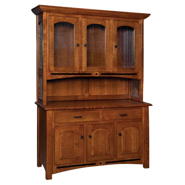 Lavega Hutch features undermount drawer slides, touch lights, beveled glass, inlays on top and bottom, glass sides, glass shelf in top, wood shelf in bottom, and standard hardware.