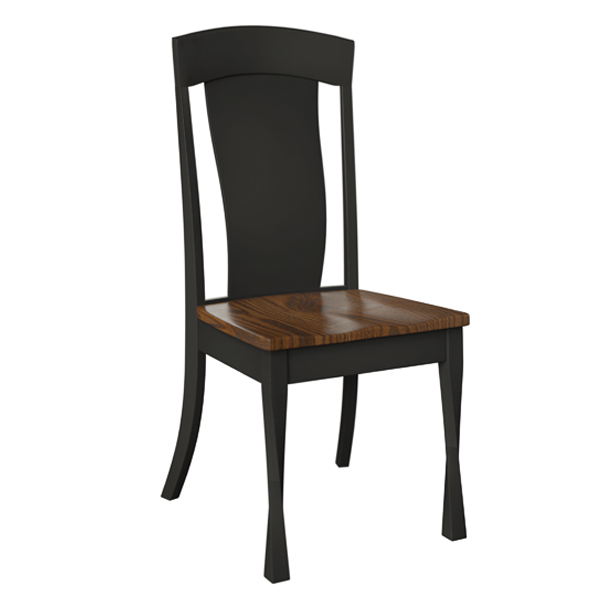 The Lemont Dining Chair features standard Saddle Scoop seat with twisted front legs. Shown in Brown Maple with Ebony stain and Oak seats with Michaels Cherry. Call to order 2 tone stains.