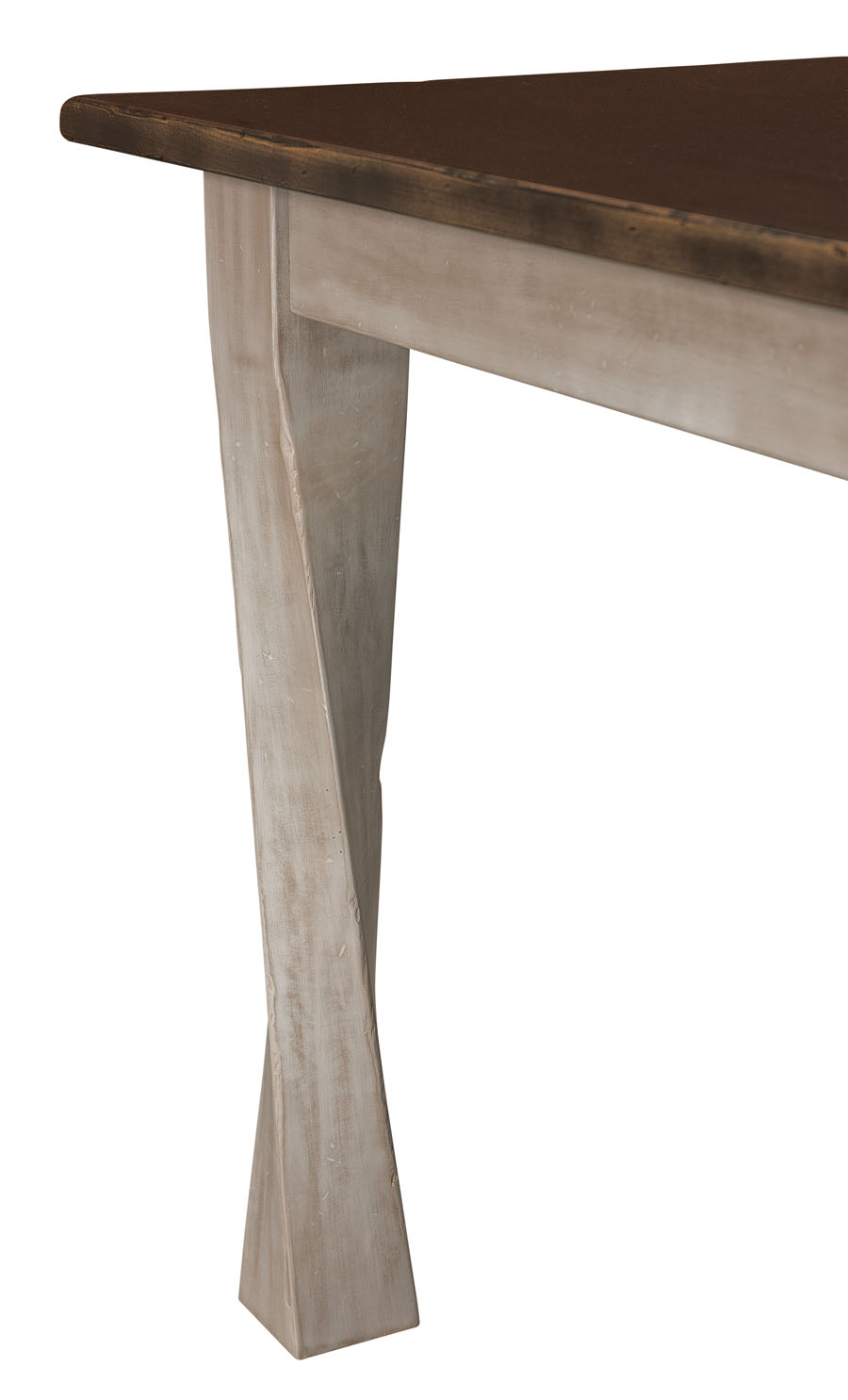 Shown in 36 x 42 with two tone stain. Twist legs give this table a unique look. Has a 1″ thick solid rectangle top with Mission edge. 2.5″ skirt standard as shown. Leaves are 12″ with skirts and do not self store in the table.