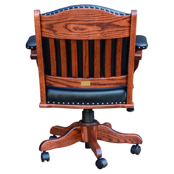 This chair comes in all the listed wood types and stain options. It is available in leather or fabric seat and is very high quality! The gas lift system allows up-down or lock the back in position. It has a tension setting for how much “rock” you want in the chair. Chair will spin 360. Also available with arms.