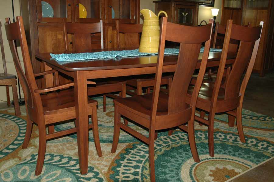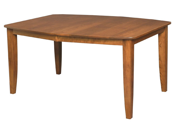 The Madison table is shown in a 42″ x 66″ with standard boat shaped top and UNDER beveled edge. You can choose from any of the woods listed in the drop-down box. We can send out stain samples upon request. Please call any questions. Leaves are 12″ with skirts. Tables with 3+ leaves will have a 5th leg for added support as the table extends.