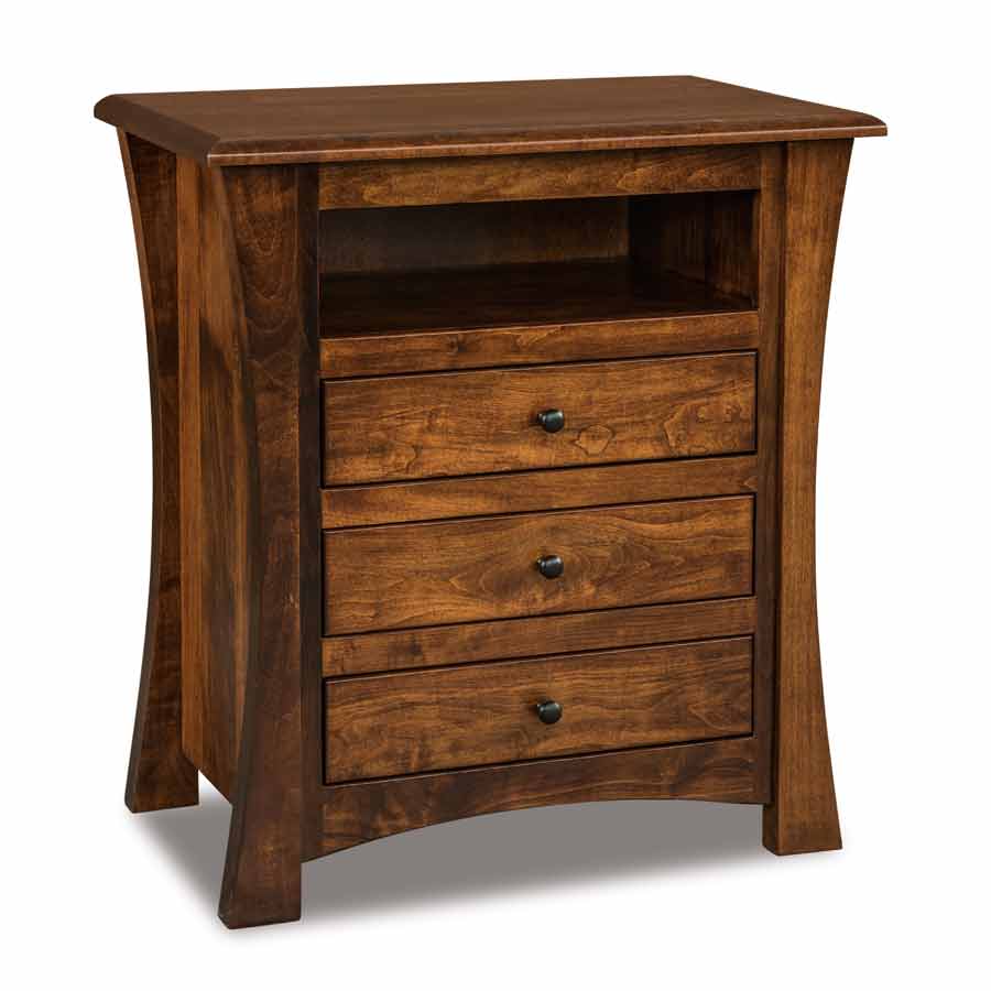 3 Drawer Nightstand with Opening. The Matison Collection features 1” solid tops, solid wood side panels, soft close door hinges on all doors, full extension drawer slides, beveled mirrors, and standard hardware is as shown.