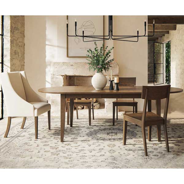 Millbrook Leg Table has a 1″ oval top with mission edge. 30″ high. 3″ skirt. Leaves are 12″ standard. 1 or more leaves will have 5th leg for added stability.