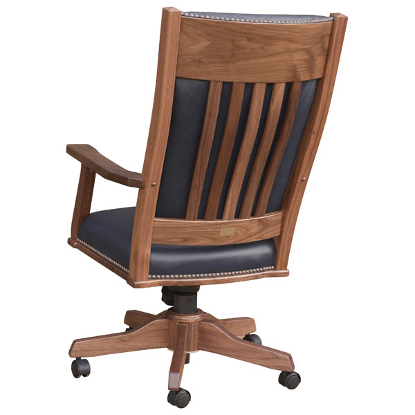 This chair comes in all the listed wood types and stain options. It is available in leather or fabric seat and is very high quality! The gas lift system allows up-down or lock the back in position. It has a tension setting for how much “rock” you want in the chair. Chair will spin 360. Also available with no arms.