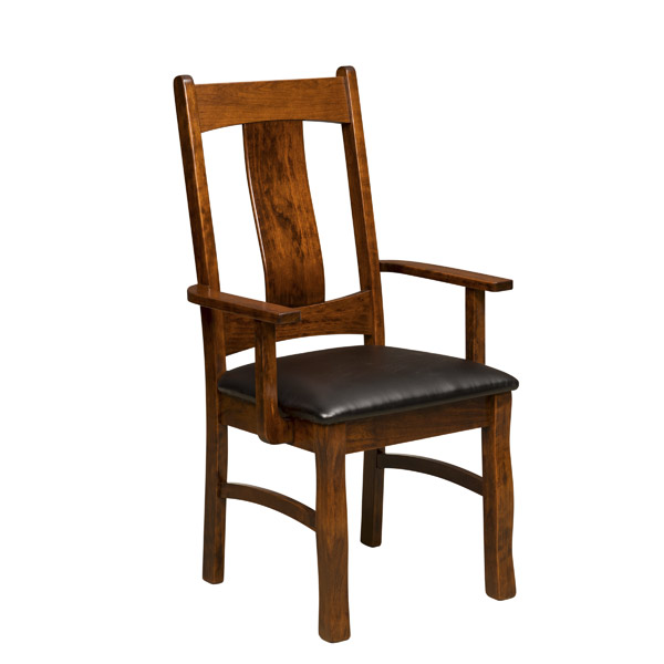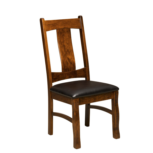 Priced as a side chair with wood seat in Oak. Available as an arm chair. Upgrade your seat to fabric or leather. Shown in Cherry with Michael’s Cherry stain and leather seat. Features a saddle scoop seat with mission edge.