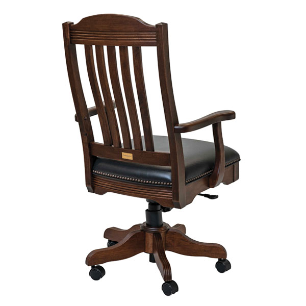 This chair comes in all the listed wood types and stain options. It is available in leather or fabric seat and is very high quality! The gas lift system allows up-down or lock the back in position. It has a tension setting for how much “rock” you want in the chair. Chair will spin 360. Also available with arms.