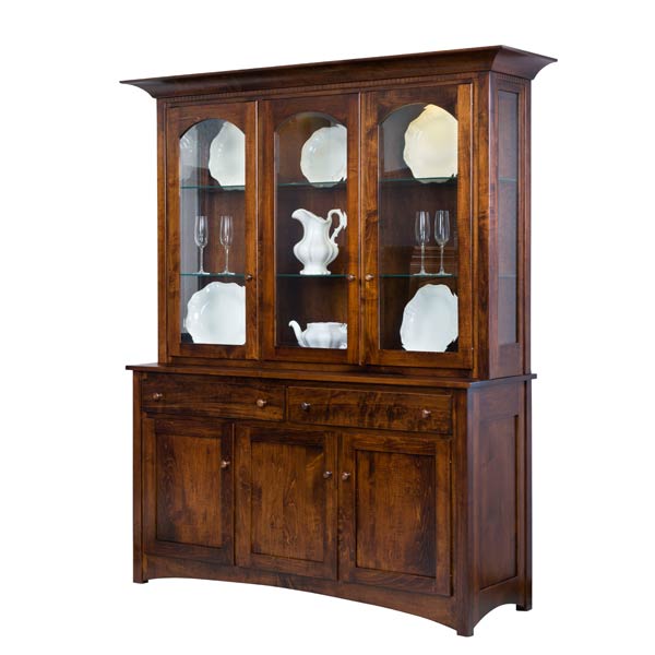 Standard Features: 3/8 inset doors, bevel glass arch doors, bevel sides, closed deck, LED lighting, 2 adjustable glass shelves with plate groove in top, fixed shelf in base, full extension side mount slides, plain wood back, and knife style hinges.