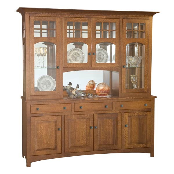 Standard Features: Flush doors with light guard, bevel and plain glass and sides, open desk, LED lighting, glass shelf with plate groove in top, fixed shelf in base, full extension side mount slides, plain wood back, dovetail drawer boxes, and European hinges.